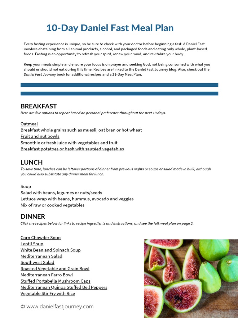 . The Daniel Fast diet is usually followed for 21 daysHowever 10 days and 40 days fasts are common. If you are more organized a little easy prep of snacks in. 2 egg omelet with 2 TBL.